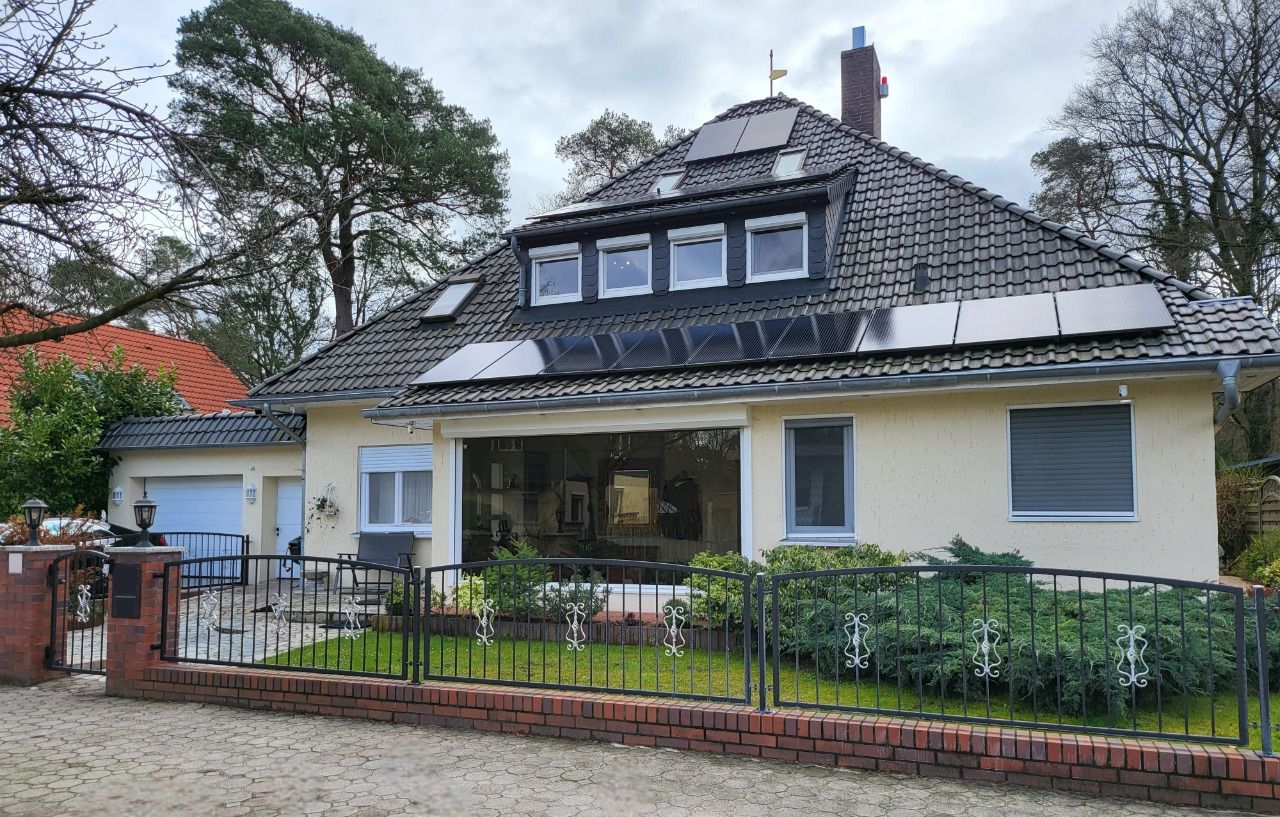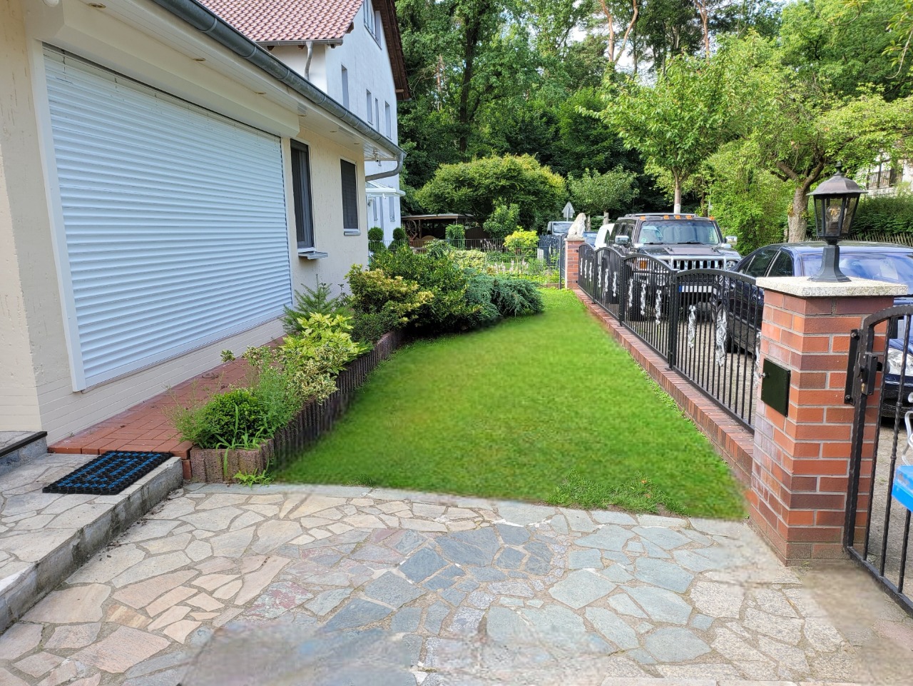 Vor dem "MilanHouse" befindet sich ein kleiner Vorgarten. Dahinter ein großes Panorama-fenster mit elektrischen Rollladen, den Hauseingang, sowie die Einfahrt zur Garage mit einem elektrischen Garagentor.
