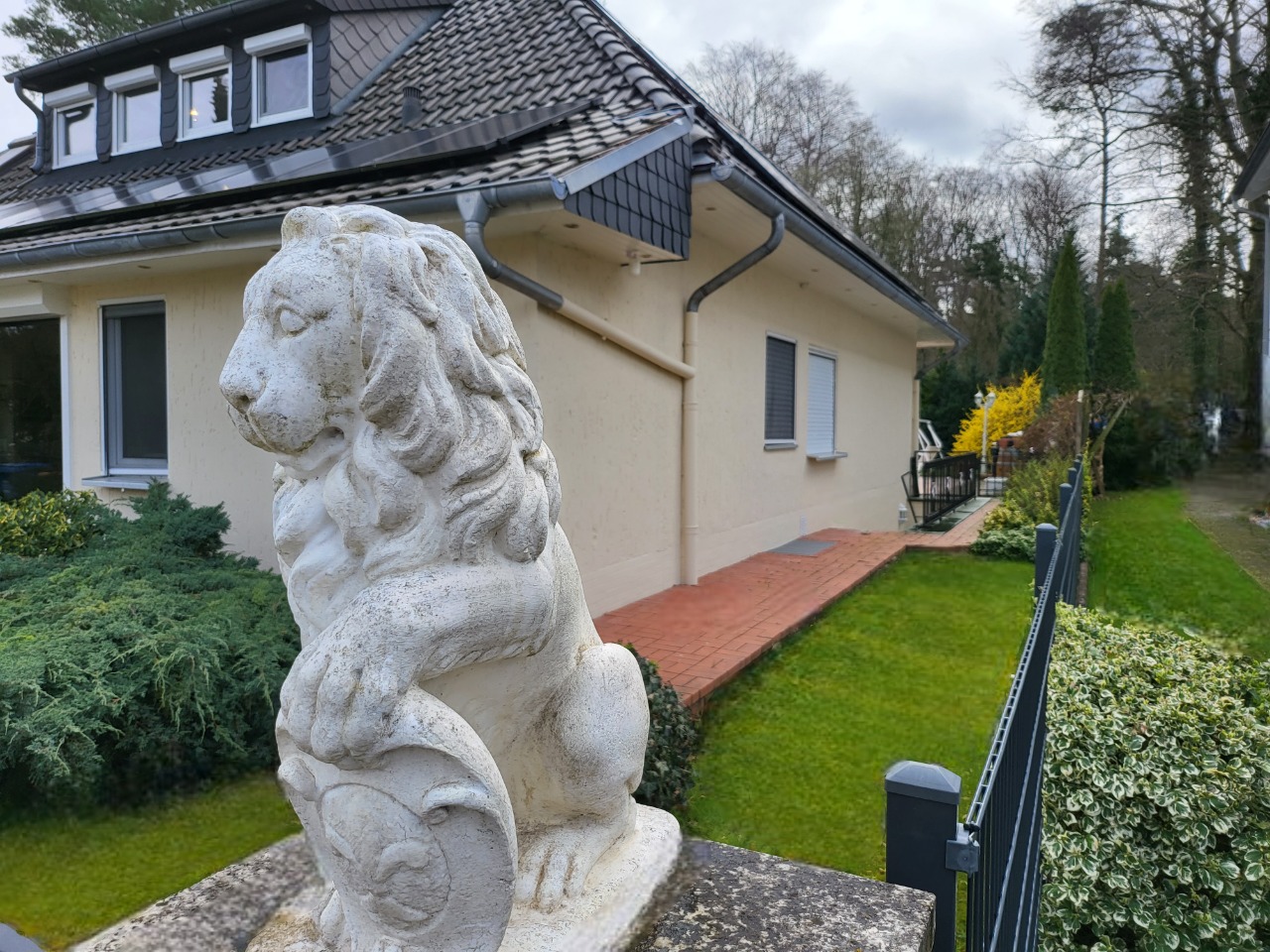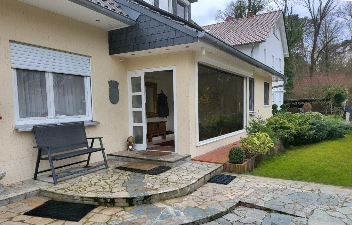 An der rechten Hausseite befinden sich die Eingänge zum Souterrain und in den Garten.