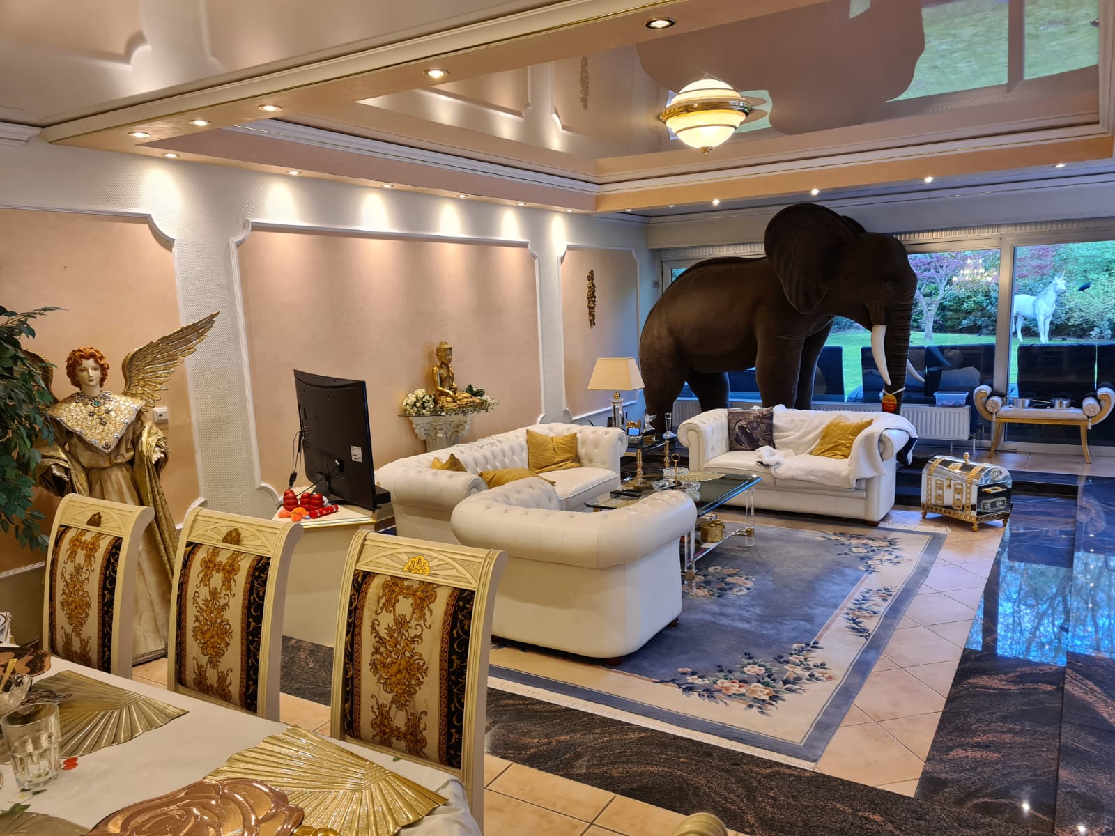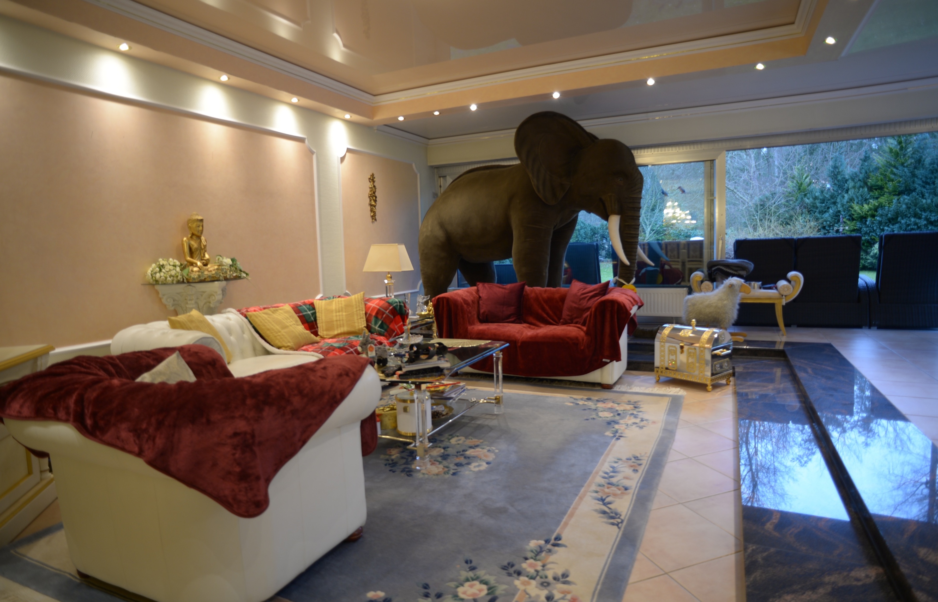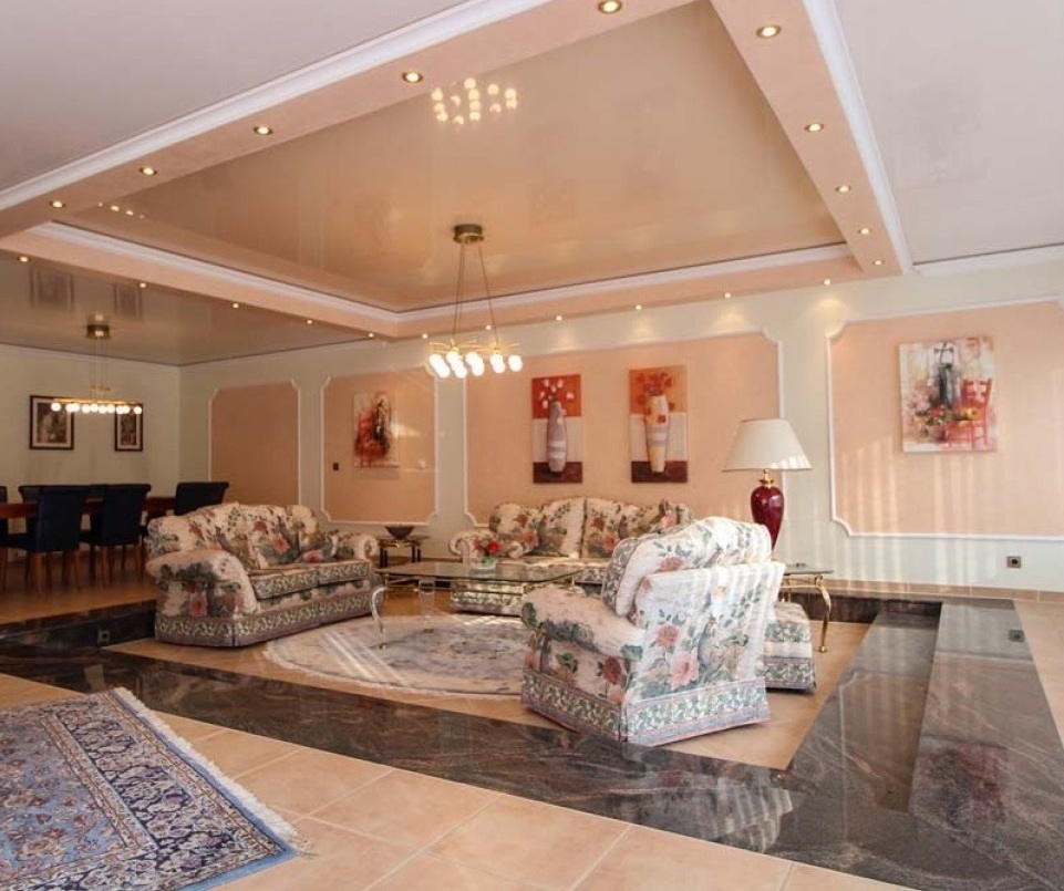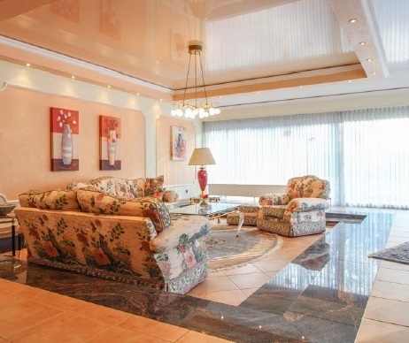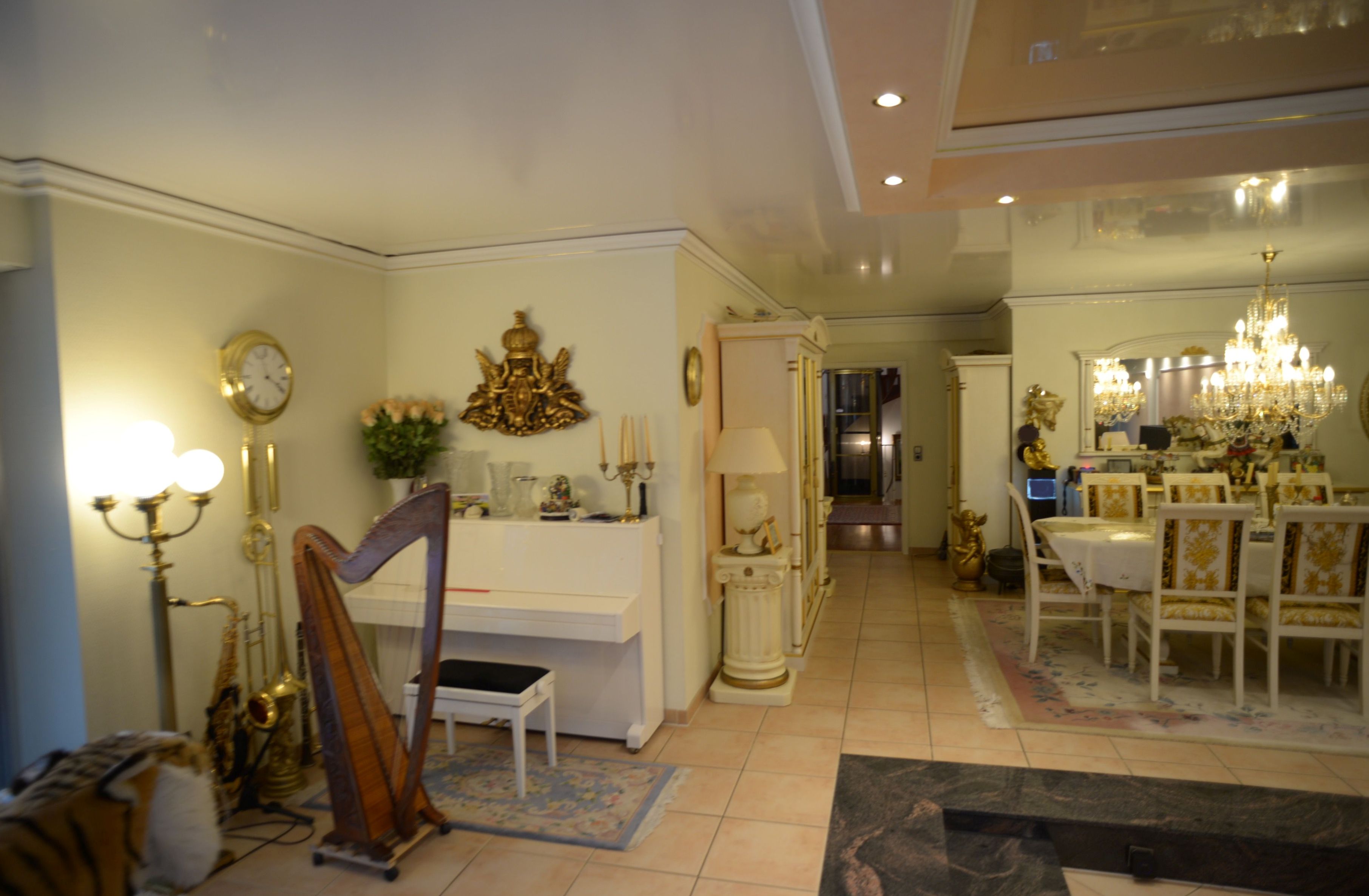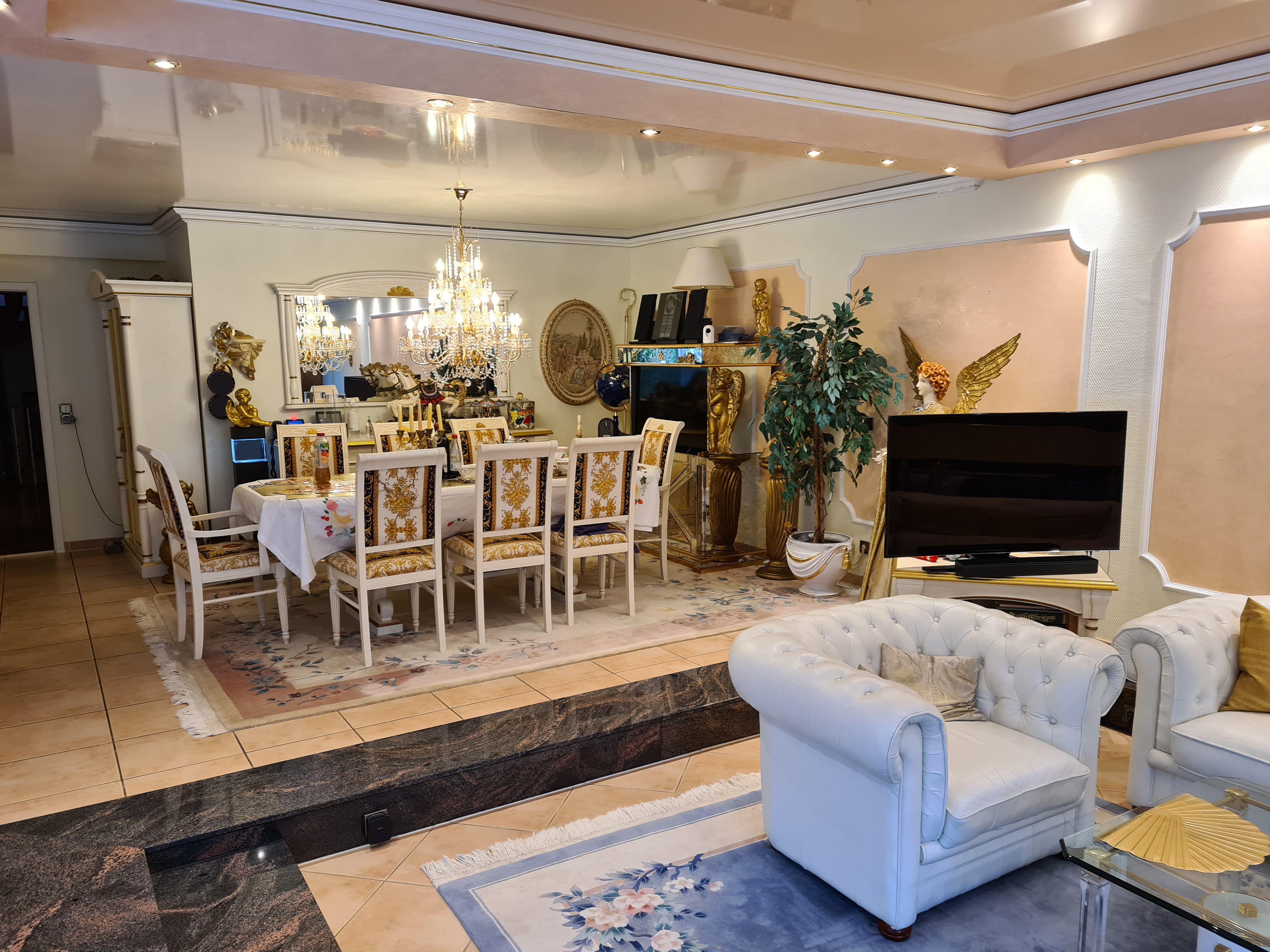 Im Erdgeschoss befindet sich ein ca. 80 qm großes Wohn- und Esszimmer (ehemaliges Schwimmbad) mit 2 großen Panoramafenstern, die mit elektrischen Rollladen betrieben werden.